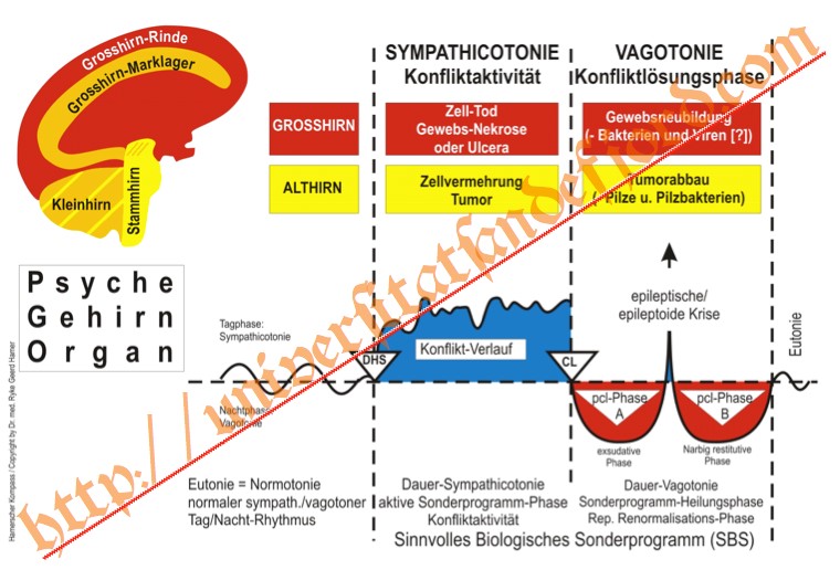 Das DHS umfasst also nicht nur den akut-dramatischen Konfliktschock, der uns „auf dem falschen Fuß“ erwischt hat, sondern auch den Inhalt des Konflikts, der ja die Lokalisation des Hamerschen Herdes im Gehirn und die Lokalisation des Krebs, der Nekrose oder die Funktonänderung am Organ determiniert.