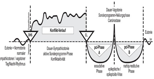 wie durch das DHS der normale Tag-Nacht-Rhythmus zu einer Dauersympathicotonie geworden ist, der so lange andauert, bis durch die Konfliktlösung, die Dauer-vagotonie eintritt.