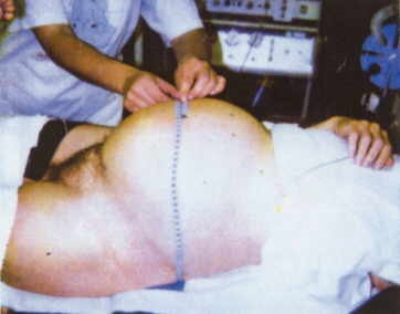 Vor der Operation indurierte Eierstockzyste nach Eierstock-Krebs. Sie füllt das ganze Bauchvolumen aus.